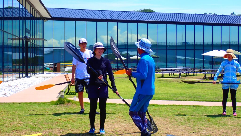 海に出る前に、パドルの持ち方や漕ぎ方をしっかり練習します。フナ/Funa(プロガイド)が分かりやすくコツを伝授するので、初めての方でもあっという間に上達しますよ!