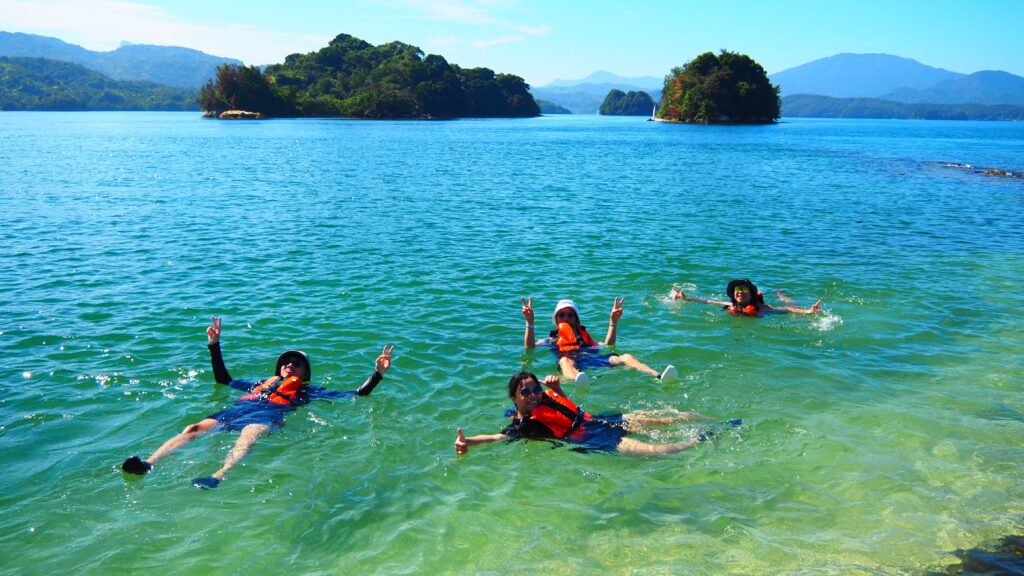島までは約30分の冒険。大きな橋の下をくぐったり、透き通る水面をのぞき込んだり。天草を知り尽くしたガイドが、その日一番美しいルートをご案内します。